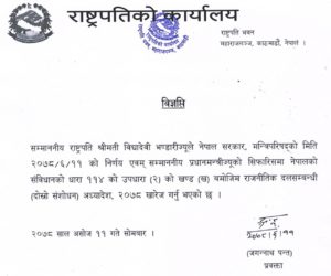 काठमाडौँ, १२ असोज । राष्ट्रपति विद्यादेवी भण्डारीले ‘राजनीतिक दलसम्बन्धी ९दोस्रो संशोधन० अध्यादेश, २०७८’ खारेज गर्नुभएको छ । मन्त्रिपरिषद्को सोमबारको बैठकले […]
