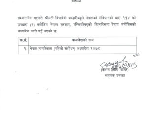 जेठ १० । आइतबार राष्ट्रपतिद्धारा जारी नागरिकतासम्बन्धी अध्यादेशमा नेपाल नागरिकता ऐन, २०६३ को दफा ३ मा संशोधन गरी नेपाल सरहदभित्र […]