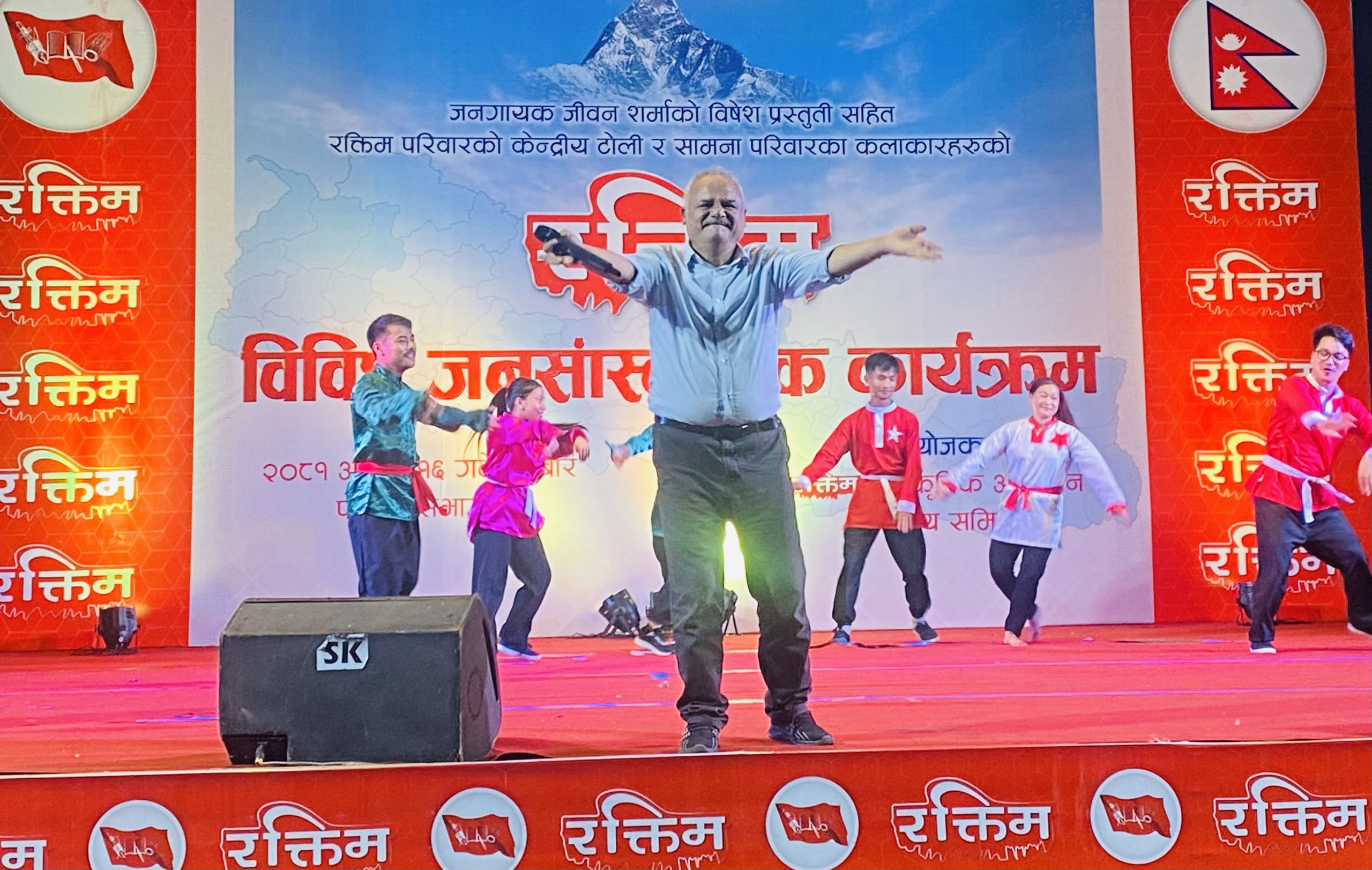 जनगायक जीवन शर्माले यो गीत गाउँदा दर्शकदीर्घाबाट एकनासले तालीको गड्गडाहट सुनिन्थ्यो । कसैले शर्माको स्वरमा स्वर मिलाए, कतिले नाचेर साथ दिए । बुधबार सन्ध्यापख जनगायक शर्मालाई रक्तिम सांस्कृतिक अभियानले पोखरा सभागृहको मञ्चमा उभ्याएपछिको माहोल यस्तै थियो । उहाँले ‘चाहिँदैन मलाई सिसाको महल…’, ‘सिमली छायाँमा बसी…’ लगायत आफ्ना चर्चित सुनाउनुभयो ।